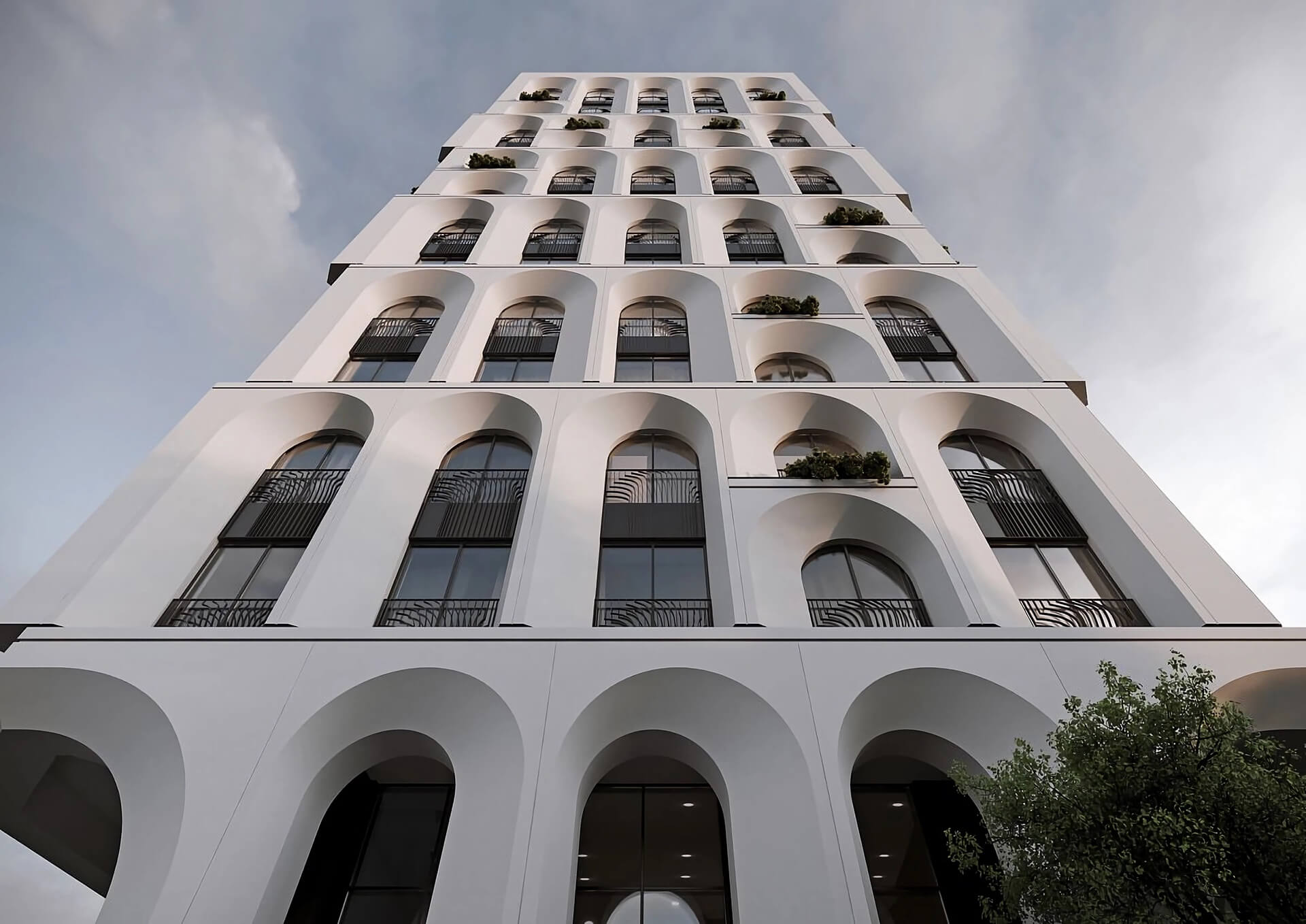 Архитектура клубного дома D'Oro Mille — это изысканное сочетание итальянского неоимпериализма и испанского неомодерна, воплощенное в уникальном авторском проекте. Здание выделяется своими элегантными фасадами, сплошь украшенными сетью стройных белоснежных арок. Этот архитектурный элемент создает выразительный ритм, подчеркивая гармонию и динамику формы.