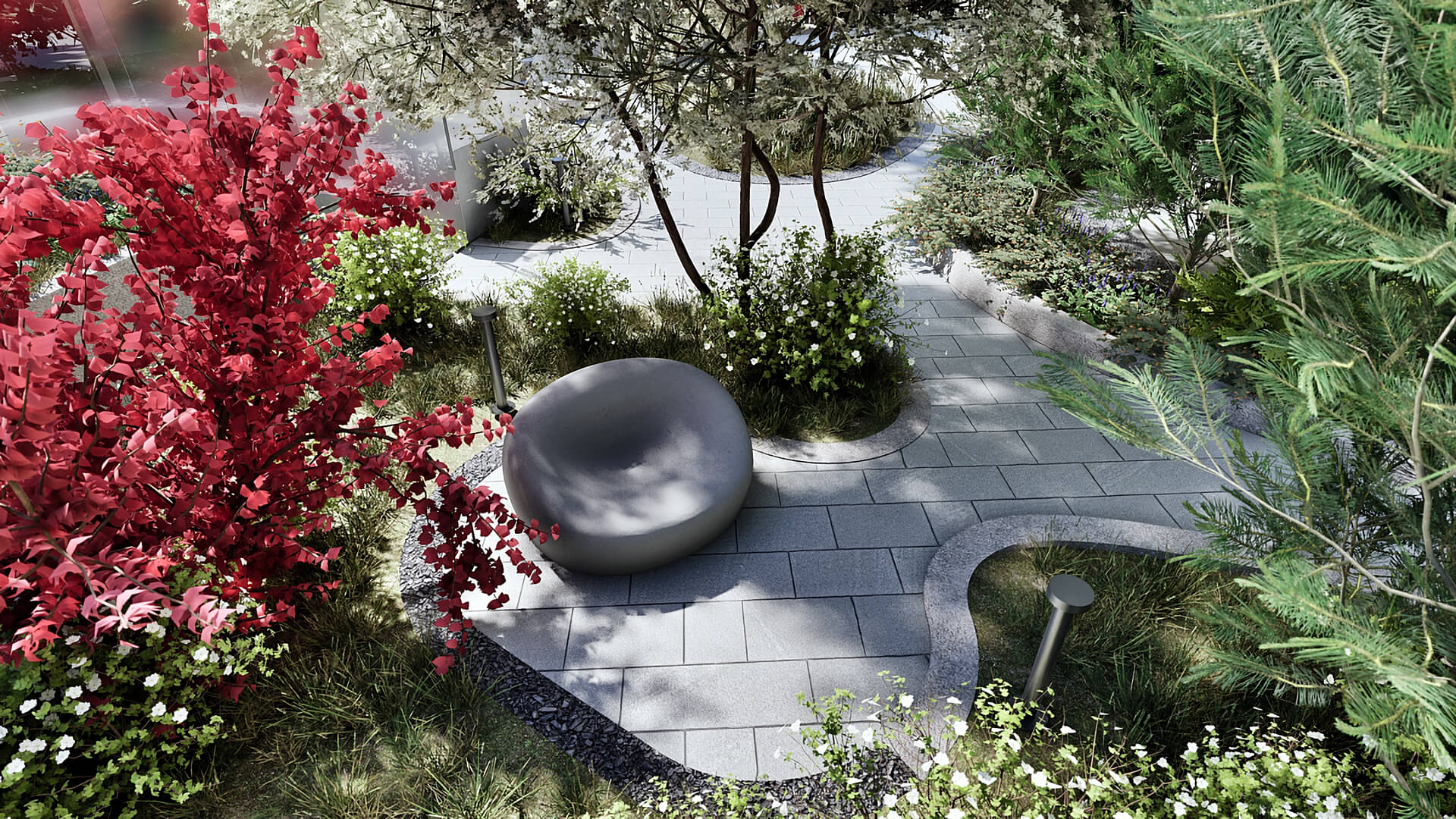 Особое внимание уделено деталям: декоративный бетонный борт, обрамляющий клумбы, выполняет роль скамьи, а малые архитектурные формы созданы эксклюзивно для проекта. Пространства функциональны и оригинальны — лаунж-зоны легко трансформируются в места для работы с ноутбуком или деловых встреч, а тренажеры, интегрированные в скульптурную композицию, вдохновляют на физическую активность.