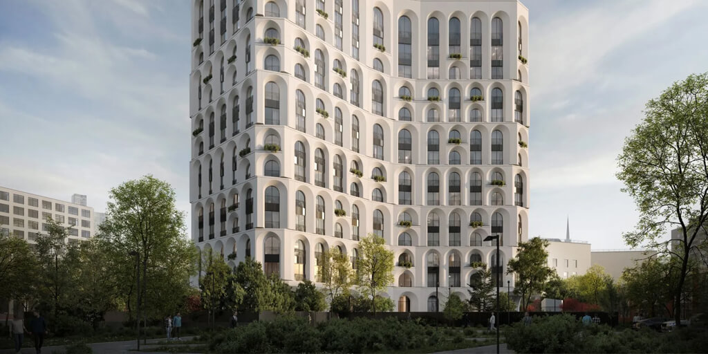 Высота арок варьируется, благодаря чему фасады приобретают визуальную многослойность и избегают однообразия. Особая обработка внутренних поверхностей арок создает игру света и тени, которая оживляет здание, придавая ему уникальный характер в зависимости от угла обзора.