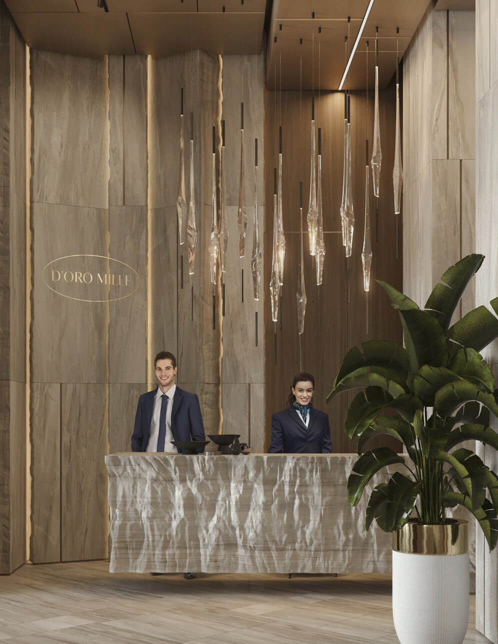 Лобби клубного дома D'Oro Mille продолжает эстетическое наследие итальянской классики, вдохновляясь аристократичным и утонченным стилем. Интерьеры общих зон — холла, гостиной и коридоров — выполнены с особой тщательностью: пропорции элементов тщательно продуманы, цветовая палитра выдержана в нейтральных тонах, а использование исключительно натуральных материалов создает ощущение роскоши.